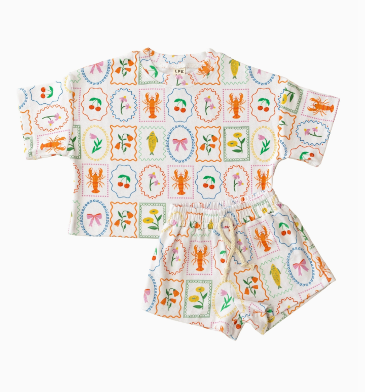 Full of coastal charm and playful color, this short set is made for sunny days and carefree adventures. Featuring a vintage-inspired print of lobsters, flowers, bows, and citrus framed in pastel borders, this matching set feels both classic and fun. Lightweight, breezy, and picture-perfect for summer